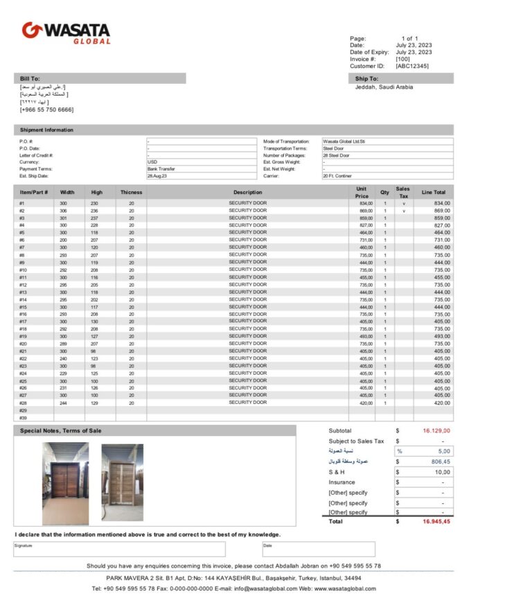 تم تقديم عرض سعر ( 28 باب مصفح حديد لمشروع فلل ) الى السيد علي العسيري بتكلفة 16.945 دولار للكمية كاملة … تفاصيل العرض في