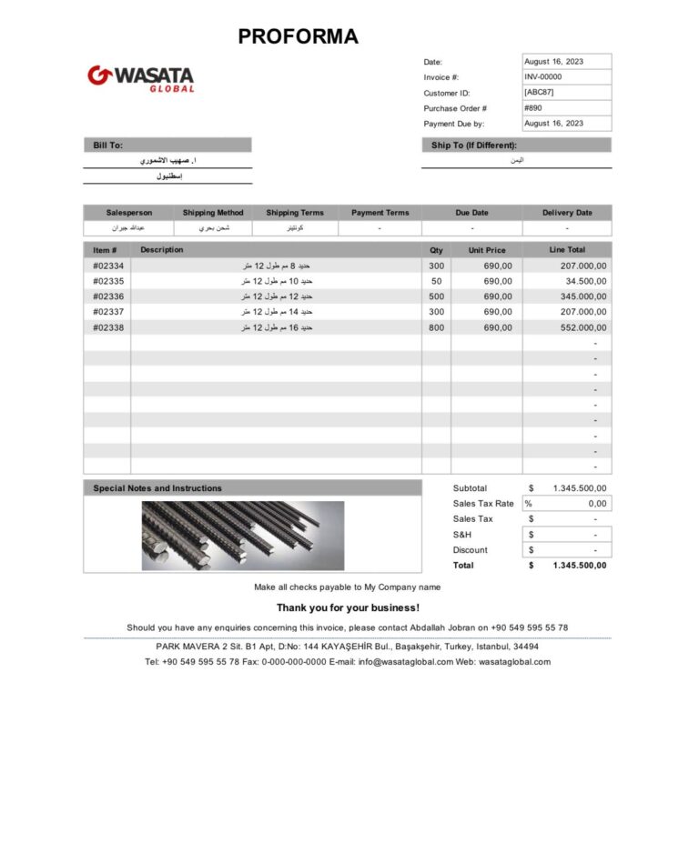 تم تقديم عرض سعر ( 1950 طن من الحديد المسلح للمقاولات ) الى احد عملاءنا من دولة اليمن بتكلفة 690 دولار للطن الواحد … تفاصيل